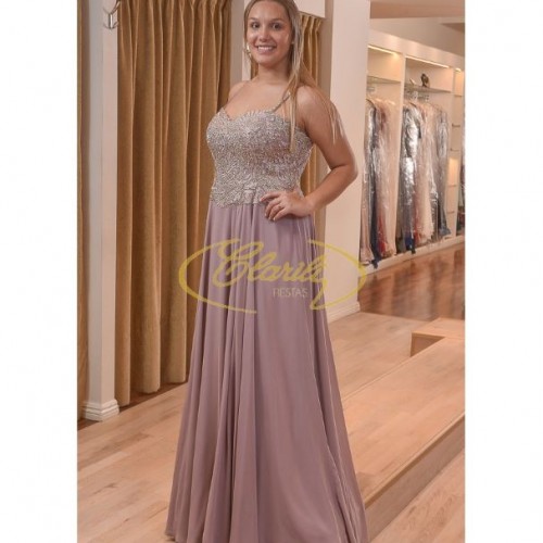 Falda al cuerpo con tajo o amplia, bordada en cintura. Top al tono, bordado en pedrería y strass, con transparencias.