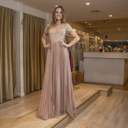 Para el diseño de este vestido se utilizó raso importado y tul bordado al tono. Es un vestido al cuerpo, con amplitud en la parte inferior.